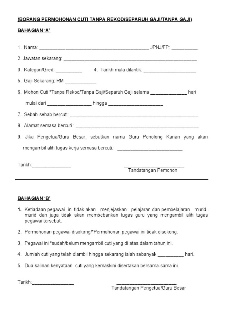 05.10.2021 · jadi, lebih baiklah anda menulis surat cuti kerja tanpa gaji disertakan bukti daripada doktor.